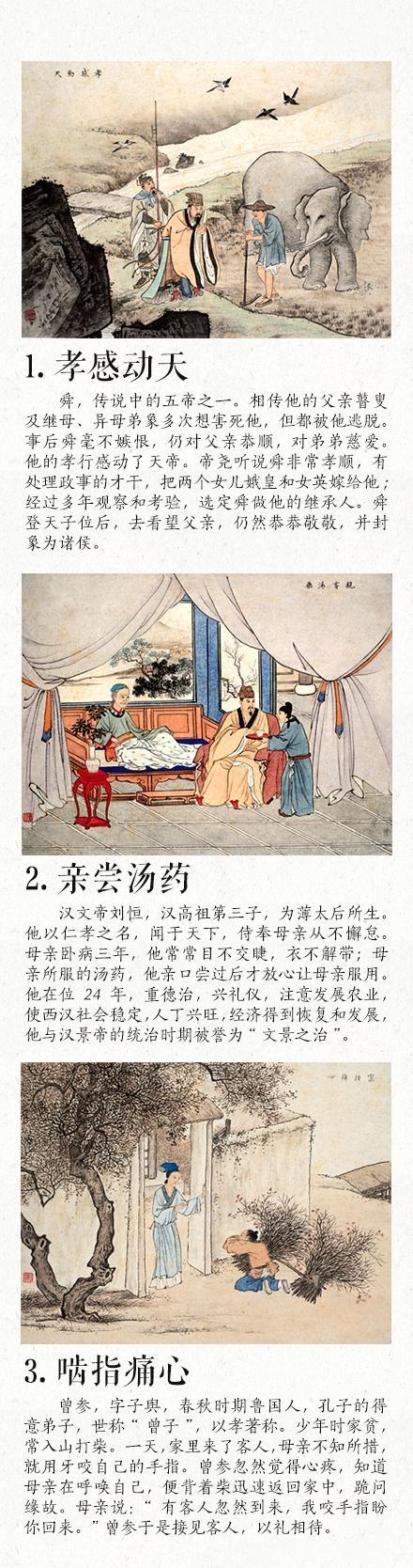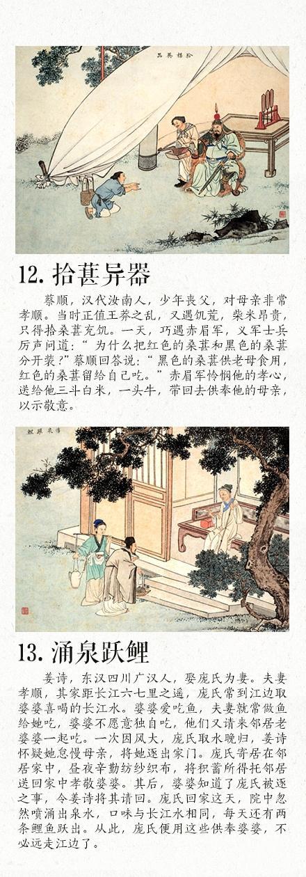“百善孝为先”,中华文明自古崇尚孝道,通过生动故事弘扬孝道:扇枕温衾、卧冰求鲤、恣蚊饱血、百里负米、闻雷泣墓......这些典故你都知道吗?