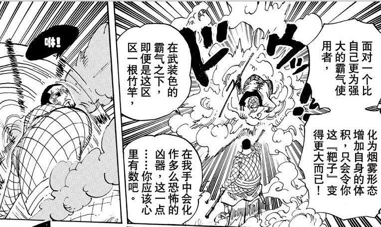 通过图可以发现,烟男的能力攻击方面和路飞有点相识,但是确没有路飞橡胶的弹性来增加攻击力,只能增加距离,或者用来加速和捕捉。也就是说他的能力只能让自己有一个流动的身体,最终还是要自己本身的实力。那么烟男自身的实力如何,先看看烟男的第一次出手。