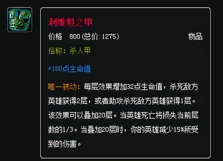 也称杀人甲,它除了能提供基础的生命值之外,还可以提供击杀次数和助攻来增加额外的生命值,在那个坦克横行的年代,这件装备实在是太BUG了,最后在V1.0.0.152版本被拳头无情的移除了