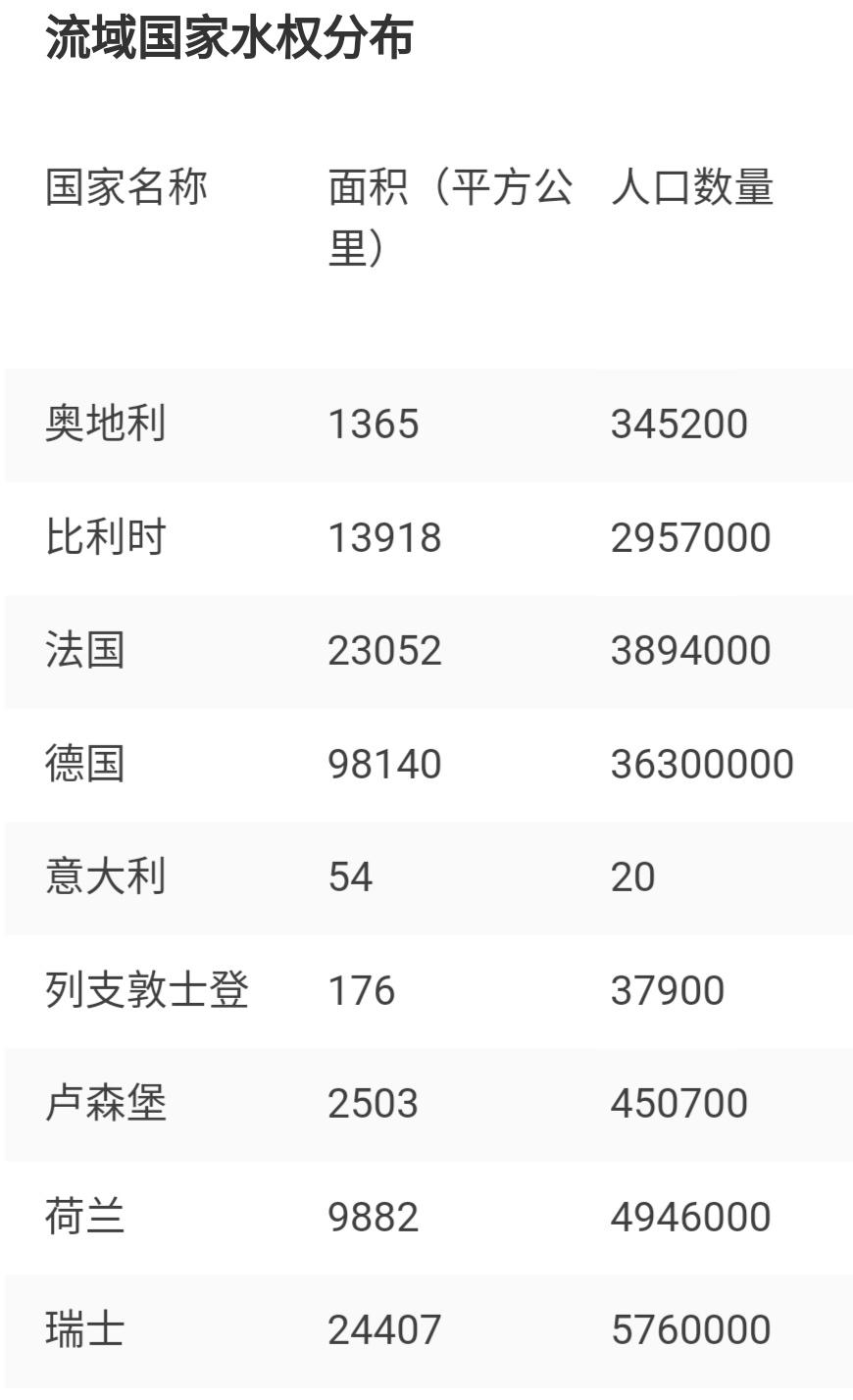 莱茵河流域面积17.3万平方公里,流经欧洲9个国家,均为发达国家,流域范围内人口数量约5400万。