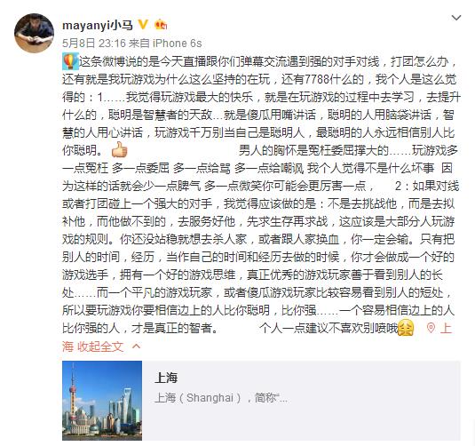 小马不仅游戏打得好,思想境界高,还能让粉丝受教,请收下小编的膝盖。