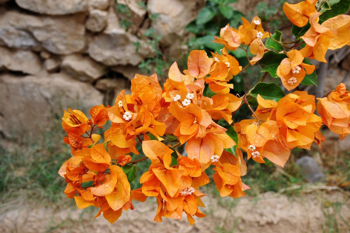 叶子花具有带刺的茎、卵形的叶子。它的花儿非常小,约莫只有手指甲大小,白色或黄色,每三朵小花包藏在色泽艳丽的三苞片中心。
