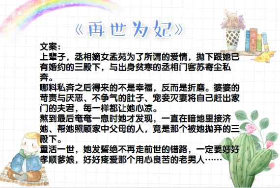 短评:双处无虐。男女主年龄相差十岁。女主七八岁的时候男主就暗搓搓看上了女主( •̀∀•́ )女主前世误会了男主加上被姨娘和庶姐算计,跟男配私奔了,那时候男女主有婚约。前世男主也不太会表达自己,跟女主关系并不好,后面女主私奔男主以为女主会幸福就成全她了。后来因为婆婆很坏,夫君纳妾,最后死在男主怀里,男主那时候已经是太子,女主死了他后悔了,就舍弃了天子的命格换两人重活一次,所以男女主都是重生的,女主比男主早一段时间。这一世过的很顺利,男主性格也改变了,对女主很好。后面写男主身体不好,是因为重生的原因,因为舍弃了天子的命格所以不能留在京城,不然会死掉,最后男带着女主去了他的封地!还有就是女主是丞相的嫡女,很疼爱女主,母亲过世,家里只有一个姨娘,女主父亲并不喜欢那个姨娘,也不看重那个庶女。