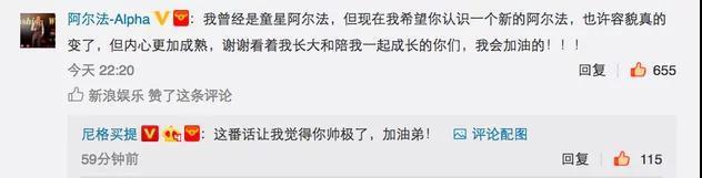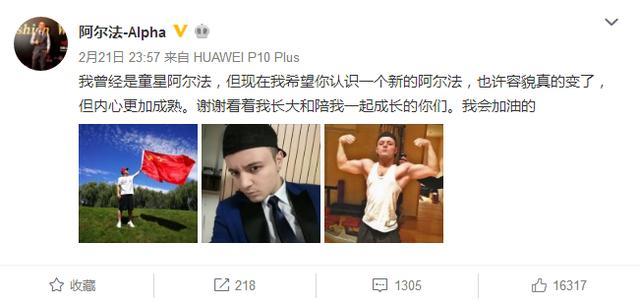 对此,阿尔法表示:“我曾经是童星阿尔法,但现在我希望你认识一个新的阿尔法,也许容貌真的变了,但内心更加成熟,谢谢看着我长大和陪我一起成长的你们,我会加油的。”