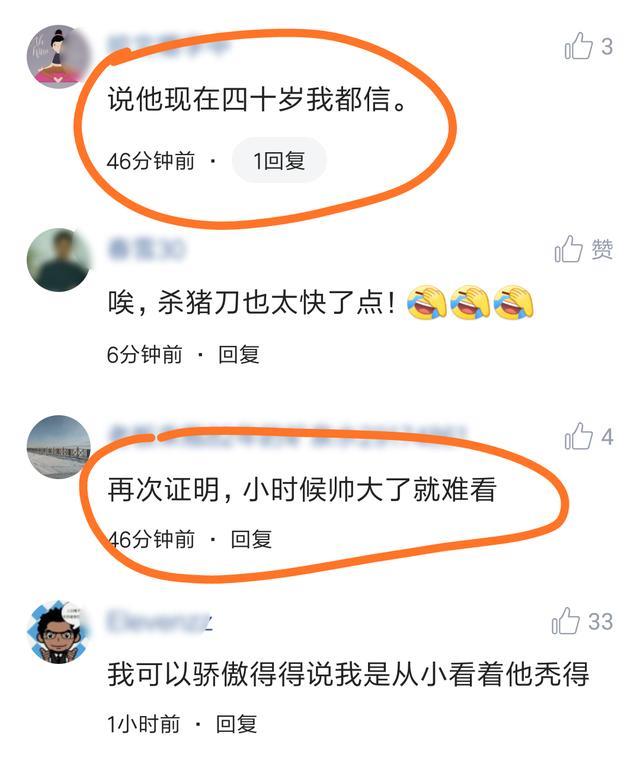 网友也纷纷吐槽:“说他现在40岁我都相信”,“唉,杀猪刀也太快了点”,“再次证明小时候帅大了就难看”,“我可以骄傲的说我是从小看着他秃的”。