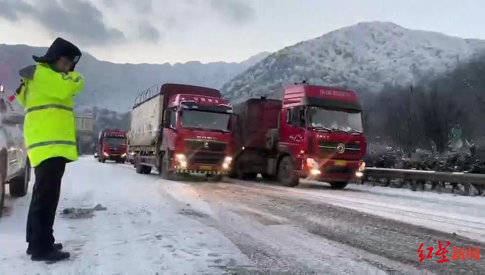 1月14日早上8时30分许,经过除冰除雪,雅西高速双向组织货车编队,由警车带道通行。上午9时40分许,雅西高速管制解除,恢复正常通行。