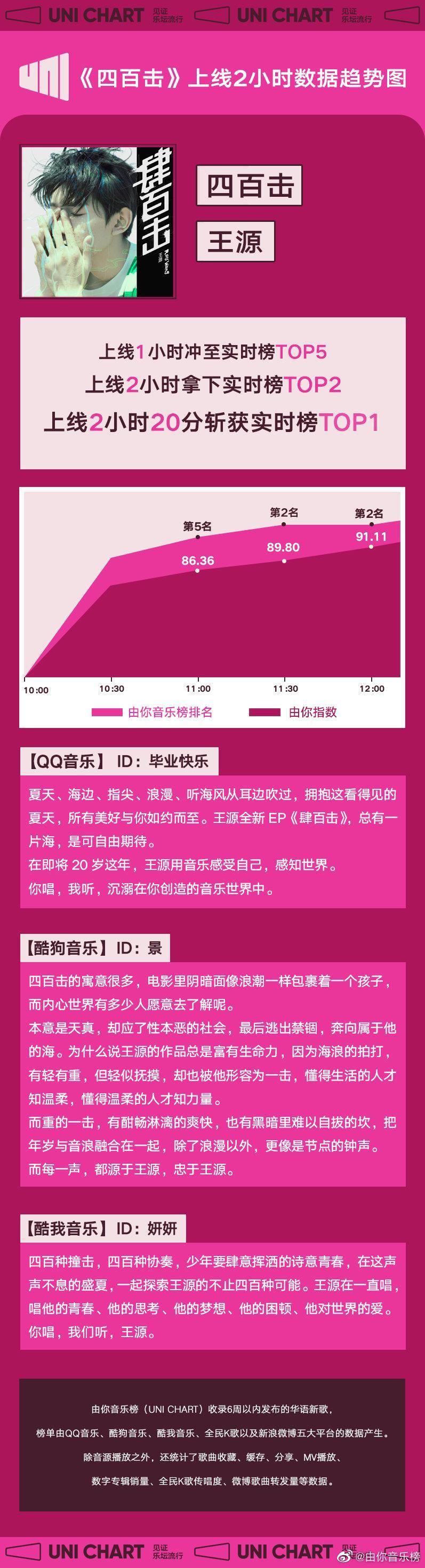 付出总归是有回报的!有一年多没有听到王源新歌的大家这次也是铆足了劲,想为王源的新歌拿下一个好成绩!《四百击》上线2小时,就直接越居由你音乐榜第一位!当真是可喜可贺!