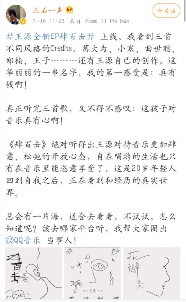 音乐圈子里的人一看就都知道王源这次得多用心!这三首歌制作出来有多烧钱!但是在音乐播放平台上,这三首歌却是完全免费的对外开放,所有人不用花钱就可以听到,可以看出王源弟弟对待音乐真的不是为了圈钱的,而是真的热爱音乐吧!所以才会投入这么多的成本去把它们做好,但是丝毫不求物质上的回报!王源,也单纯只是希望更多的人能够来听一听他的歌而已!
