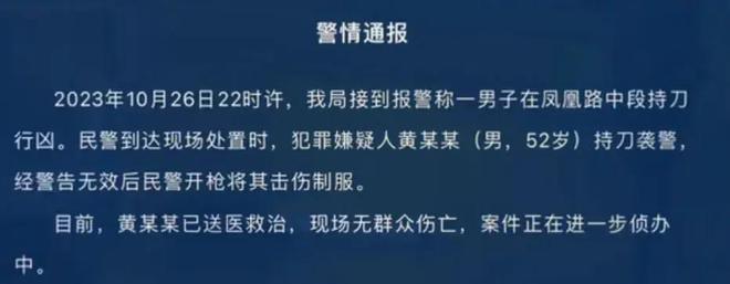 随后,警方发布通报称,10月26日晚上10点左右,乐沙纳警方接到报警称,一名男子在凤凰路中部持刀行凶。警察到达现场并袭击了警察。嫌疑人最终被枪杀并受伤,然后被制服。嫌疑人也被送往医院接受治疗。现场没有人员伤亡,案件正在调查中。