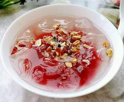 食材:冰粉1袋、清水750斤、干果30克、蓝莓醋20克