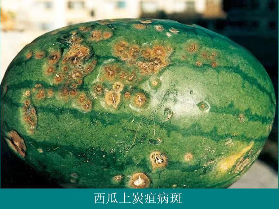 为半知菌亚门的炭疽病菌浸染所致,土壤、病株残体、种子均能带菌,借雨水和灌溉传播再侵染。病菌传播适宜温度为10~30℃,以气温20~26℃、相对湿度90%~95%最适合其流行,地势低洼、排水不良,或氮肥过多、通风不良、重茬地发病重。重病田或雨后收获的西瓜在储运过程中也发病。