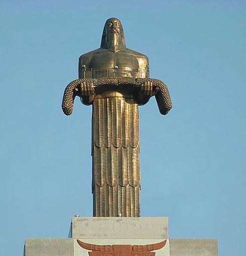 老顶山有关炎帝的传说及炎帝活动的遗迹很多,以炎帝为中心的开发,使老顶山成为始祖之山,其文化内涵源远流长,可与山西洪洞大槐树相媲美。为纪念炎帝,文物管理部门投资500多万元,塑造了炎帝铜像,总重量100吨,由中国著名雕塑家钱绍武先生设计,1990年9月1日奠基,1995年10月安装完成。基座上的炎帝铜像为全身站立像,披发、赤臂,上身着兽皮,下身以树叶相遮,微微抬起的双手捧着一捆谷穗,其面部神态庄严肃穆,气度非凡,是以一个神化了的人的形象设计,突出体现了对先祖的崇拜和敬仰。铜像面向着长治市区的方向,仿佛中国的祖先炎帝仍在关切地注视着他的子孙后代。