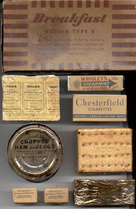 K类口粮明细:黄油、饼干、奶酪、砂糖、果酱、速溶咖啡、巧克力、口香糖、火腿罐头、午餐肉罐头、开瓶器、餐勺、餐巾纸、火柴、香烟、奶片、牛肉罐头。
