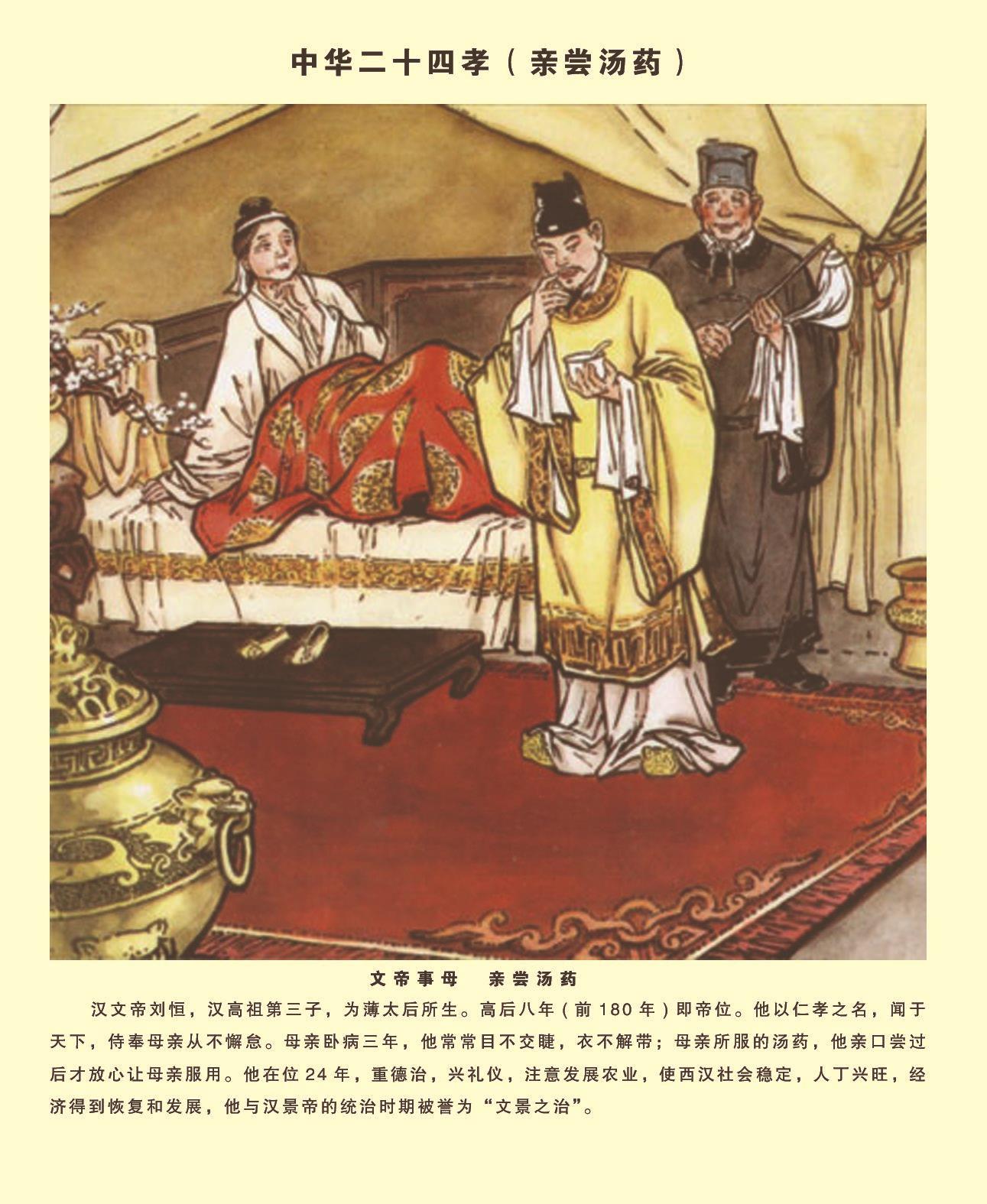 汉文帝刘恒,汉高祖第三子,为薄太后所生。高后八年(前180年)即帝位。他以仁孝之名,闻于天下,侍奉母亲从不懈怠。母亲卧病三年,他常常目不交睫,衣不解带;母亲所服的汤药,他亲口尝过后才放心让母亲服用。他在位24年,重德治,兴礼仪,注意发展农业,使西汉社会稳定,人丁兴旺,经济得到恢复和发展,他与汉景帝的统治时期被誉为“文景之治”。