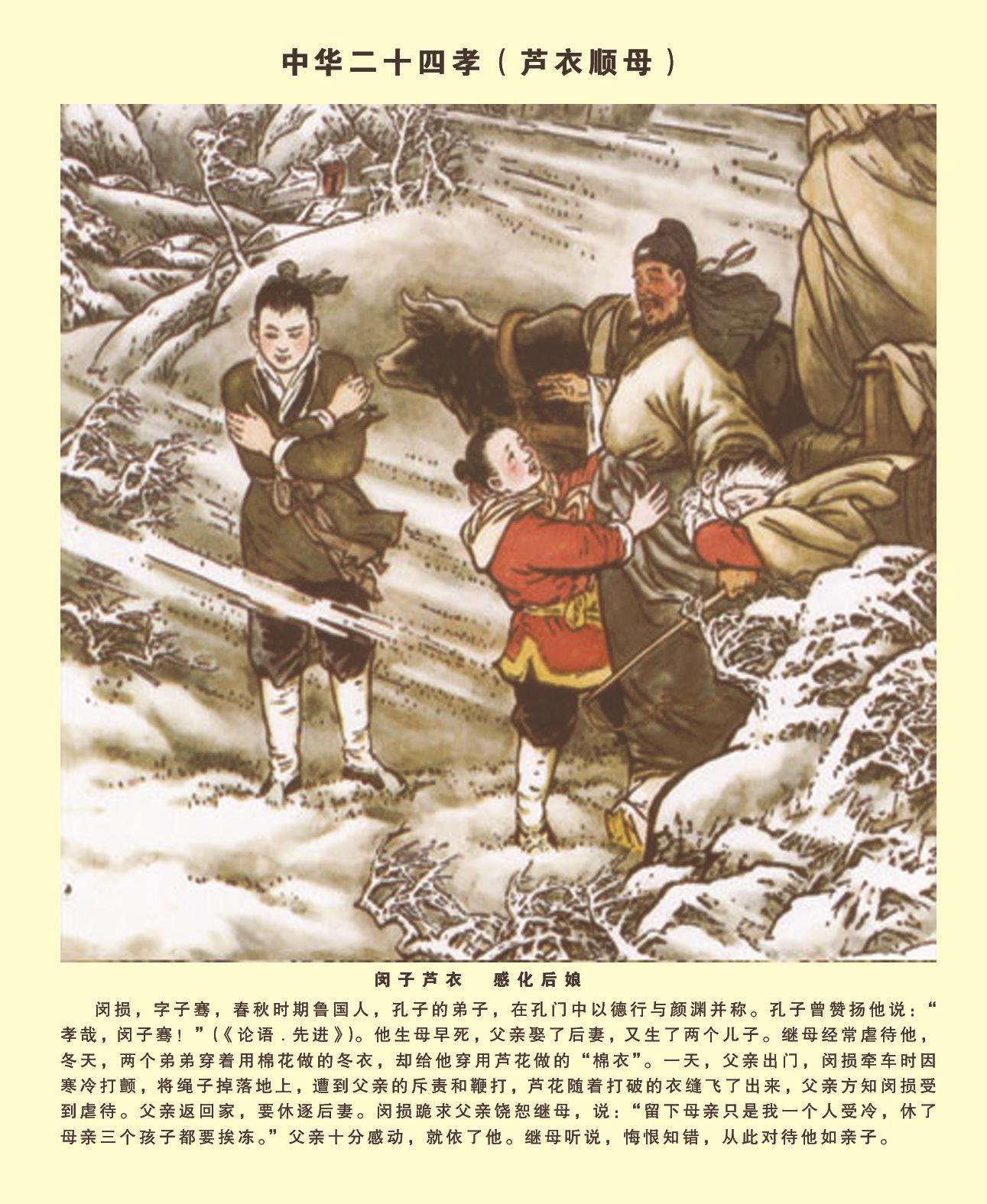 闵损,字子骞,春秋时期鲁国人,孔子的弟子,在孔门中以德行与颜渊并称。孔子曾赞扬他说:“孝哉,闵子骞!”(《论语.先进》)。他生母早死,父亲娶了后妻,又生了两个儿子。继母经常虐待他,冬天,两个弟弟穿着用棉花做的冬衣,却给他穿用芦花做的“棉衣”。一天,父亲出门,闵损牵车时因寒冷打颤,将绳子掉落地上,遭到父亲的斥责和鞭打,芦花随着打破的衣缝飞了出来,父亲方知闵损受到虐待。父亲返回家,要休逐后妻。闵损跪求父亲饶恕继母,说:“留下母亲只是我一个人受冷,休了母亲三个孩子都要挨冻。”父亲十分感动,就依了他。继母听说,悔恨知错,从此对待他如亲子。