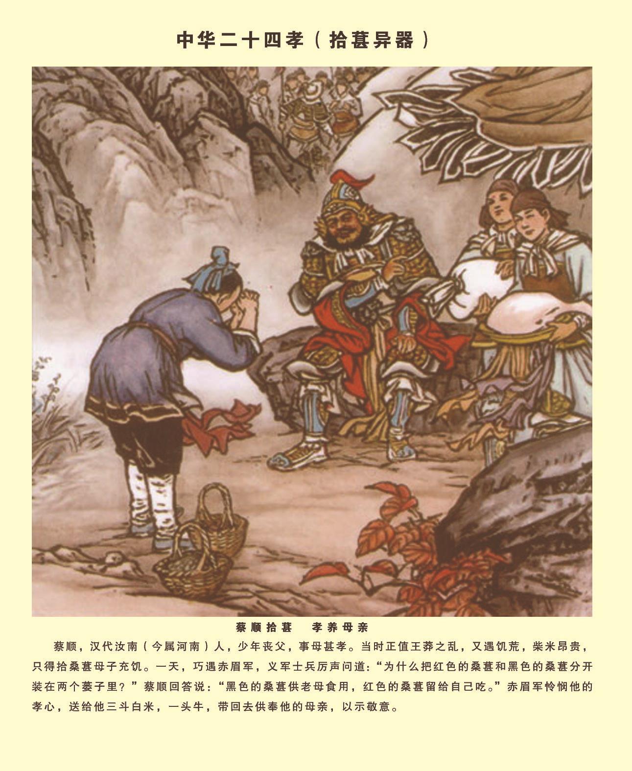 蔡顺,汉代汝南(今属河南)人,少年丧父,事母甚孝。当时正值王莽之乱,又遇饥荒,柴米昂贵,只得拾桑葚母子充饥。一天,巧遇赤眉军,义军士兵厉声问道:“为什么把红色的桑葚和黑色的桑葚分开装在两个蒌子里?”蔡顺回答说:“黑色的桑葚供老母食用,红色的桑葚留给自己吃。”赤眉军怜悯他的孝心,送给他三斗白米,一头牛,带回去供奉他的母亲,以示敬意。
