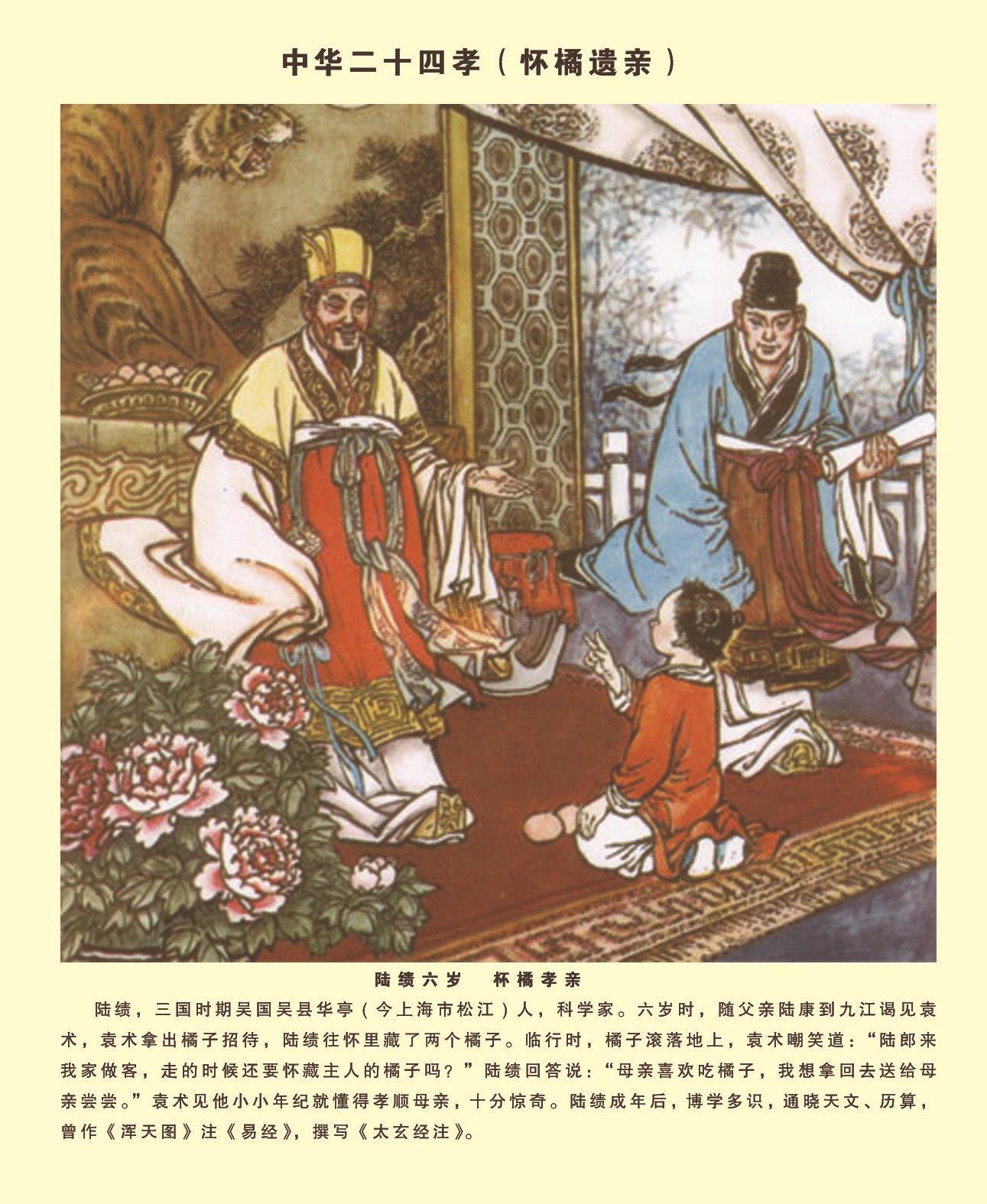 陆绩,三国时期吴国吴县华亭(今上海市松江)人,科学家。六岁时,随父亲陆康到九江谒见袁术,袁术拿出橘子招待,陆绩往怀里藏了两个橘子。临行时,橘子滚落地上,袁术嘲笑道:“陆郎来我家做客,走的时候还要怀藏主人的橘子吗?”陆绩回答说:“母亲喜欢吃橘子,我想拿回去送给母亲尝尝。”袁术见他小小年纪就懂得孝顺母亲,十分惊奇。陆绩成年后,博学多识,通晓天文、历算,曾作《浑天图》注《易经》,撰写《太玄经注》。