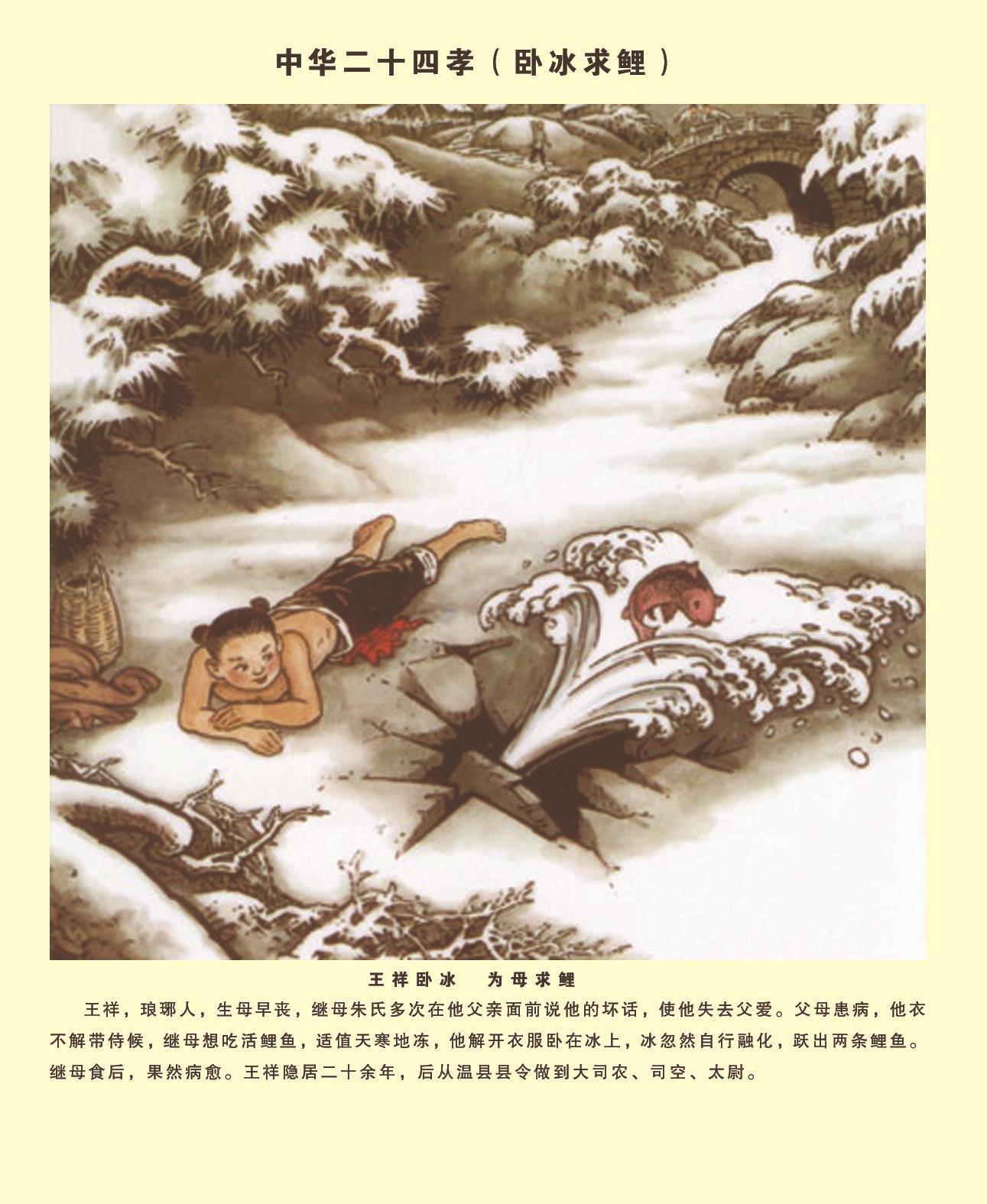 王祥,琅琊人,生母早丧,继母朱氏多次在他父亲面前说他的坏话,使他失去父爱。父母患病,他衣不解带侍候,继母想吃活鲤鱼,适值天寒地冻,他解开衣服卧在冰上,冰忽然自行融化,跃出两条鲤鱼。继母食后,果然病愈。王祥隐居二十余年,后从温县县令做到大司农、司空、太尉。
