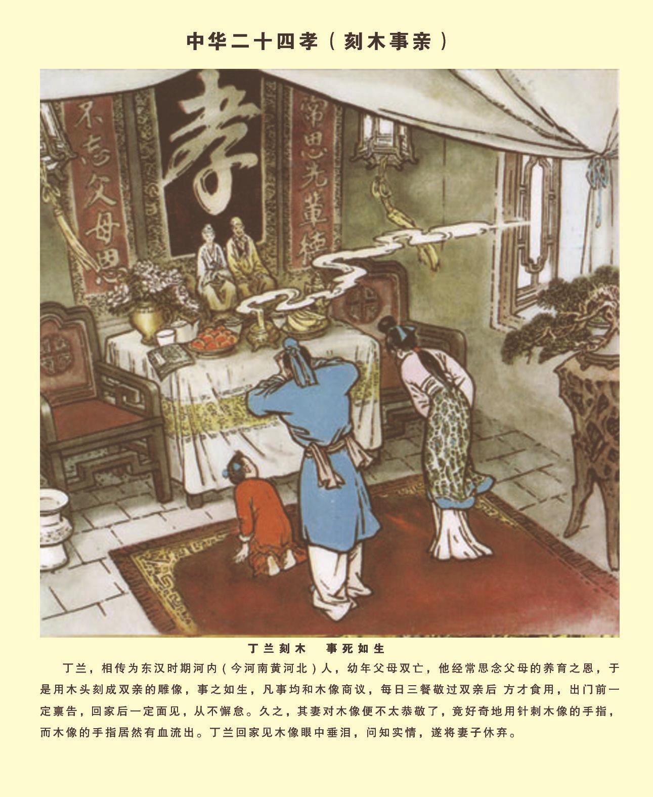 丁兰,相传为东汉时期河内(今河南黄河北)人,幼年父母双亡,他经常思念父母的养育之恩,于是用木头刻成双亲的雕像,事之如生,凡事均和木像商议,每日三餐敬过双亲后臫方才食用,出门前一定禀告,回家后一定面见,从不懈怠。久之,其妻对木像便不太恭敬了,竟好奇地用针刺木像的手指,而木像的手指居然有血流出。丁兰回家见木像眼中垂泪,问知实情,遂将妻子休弃。