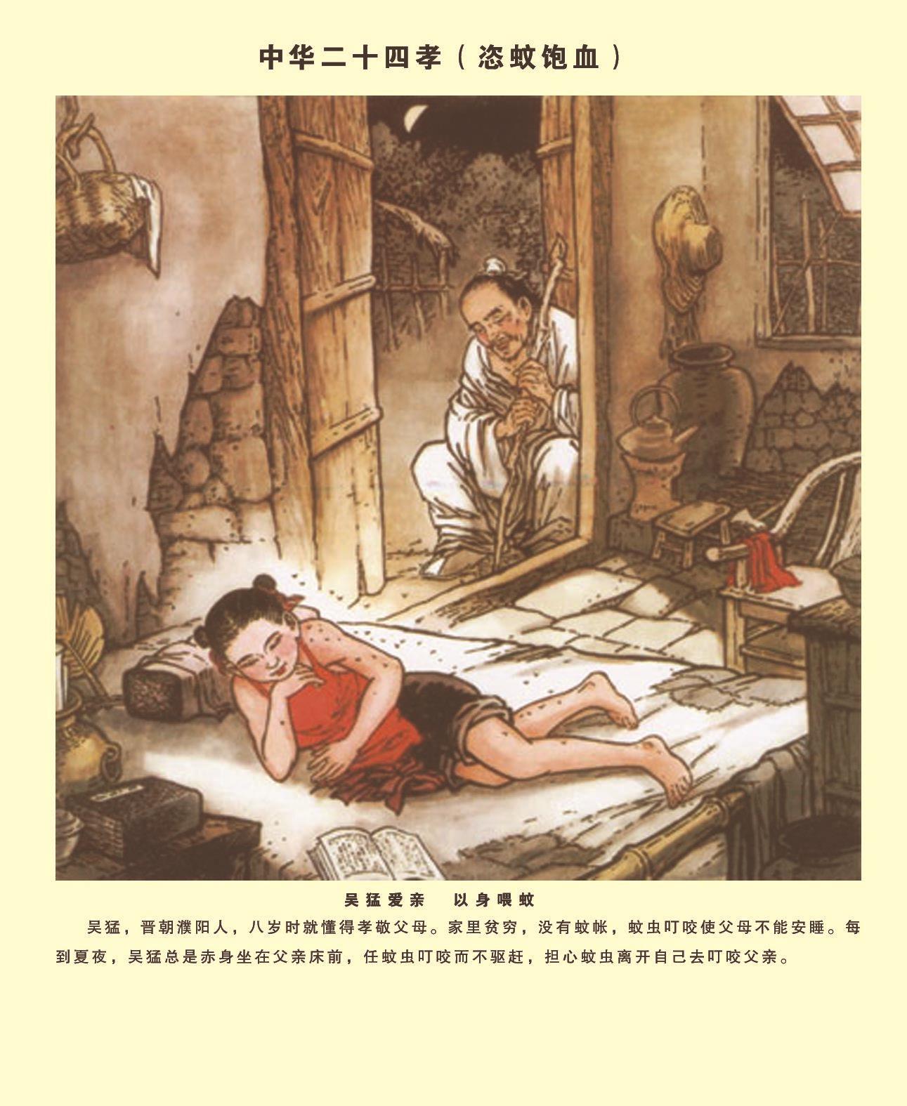 吴猛,晋朝濮阳人,八岁时就懂得孝敬父母。家里贫穷,没有蚊帐,蚊虫叮咬使父母不能安睡。每到夏夜,吴猛总是赤身坐在父亲床前,任蚊虫叮咬而不驱赶,担心蚊虫离开自己去叮咬父亲。