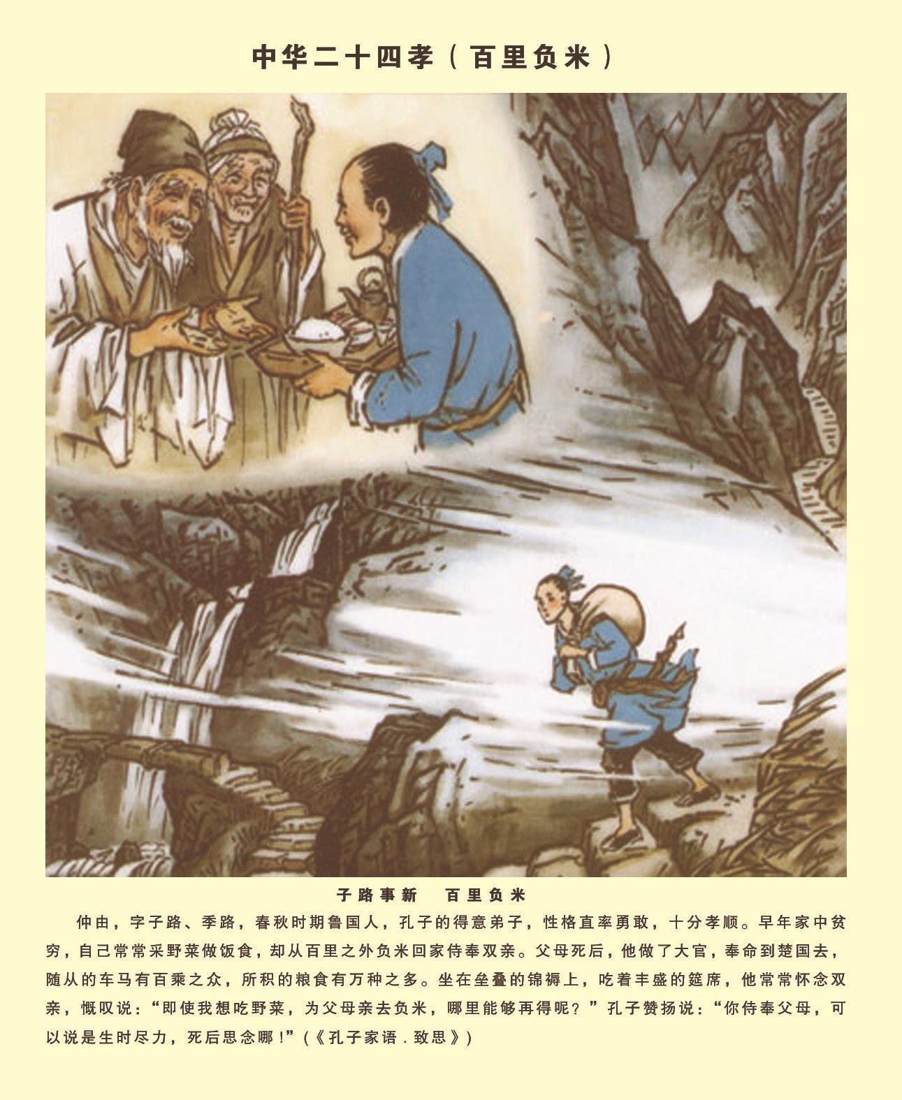 仲由,字子路、季路,春秋时期鲁国人,孔子的得意弟子,性格直率勇敢,十分孝顺。早年家中贫穷,自己常常采野菜做饭食,却从百里之外负米回家侍奉双亲。父母死后,他做了大官,奉命到楚国去,随从的车马有百乘之众,所积的粮食有万种之多。坐在垒叠的锦褥上,吃着丰盛的筵席,他常常怀念双亲,慨叹说:“即使我想吃野菜,为父母亲去负米,哪里能够再得呢?”孔子赞扬说:“你侍奉父母,可以说是生时尽力,死后思念哪!”(《孔子家语.致思》)