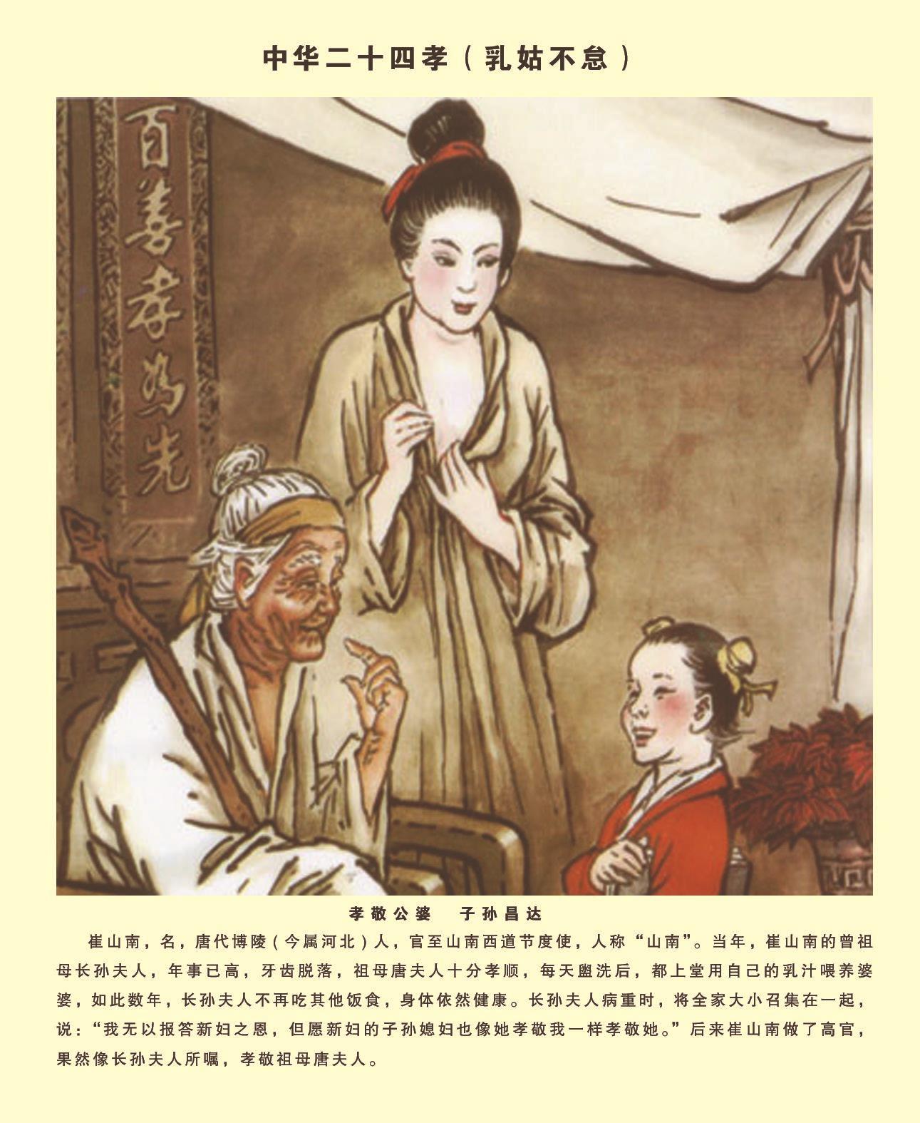 崔山南,名,唐代博陵(今属河北)人,官至山南西道节度使,人称“山南”。当年,崔山南的曾祖母长孙夫人,年事已高,牙齿脱落,祖母唐夫人十分孝顺,每天盥洗后,都上堂用自己的乳汁喂养婆婆,如此数年,长孙夫人不再吃其他饭食,身体依然健康。长孙夫人病重时,将全家大小召集在一起,说:“我无以报答新妇之恩,但愿新妇的子孙媳妇也像她孝敬我一样孝敬她。”后来崔山南做了高官,果然像长孙夫人所嘱,孝敬祖母唐夫人。