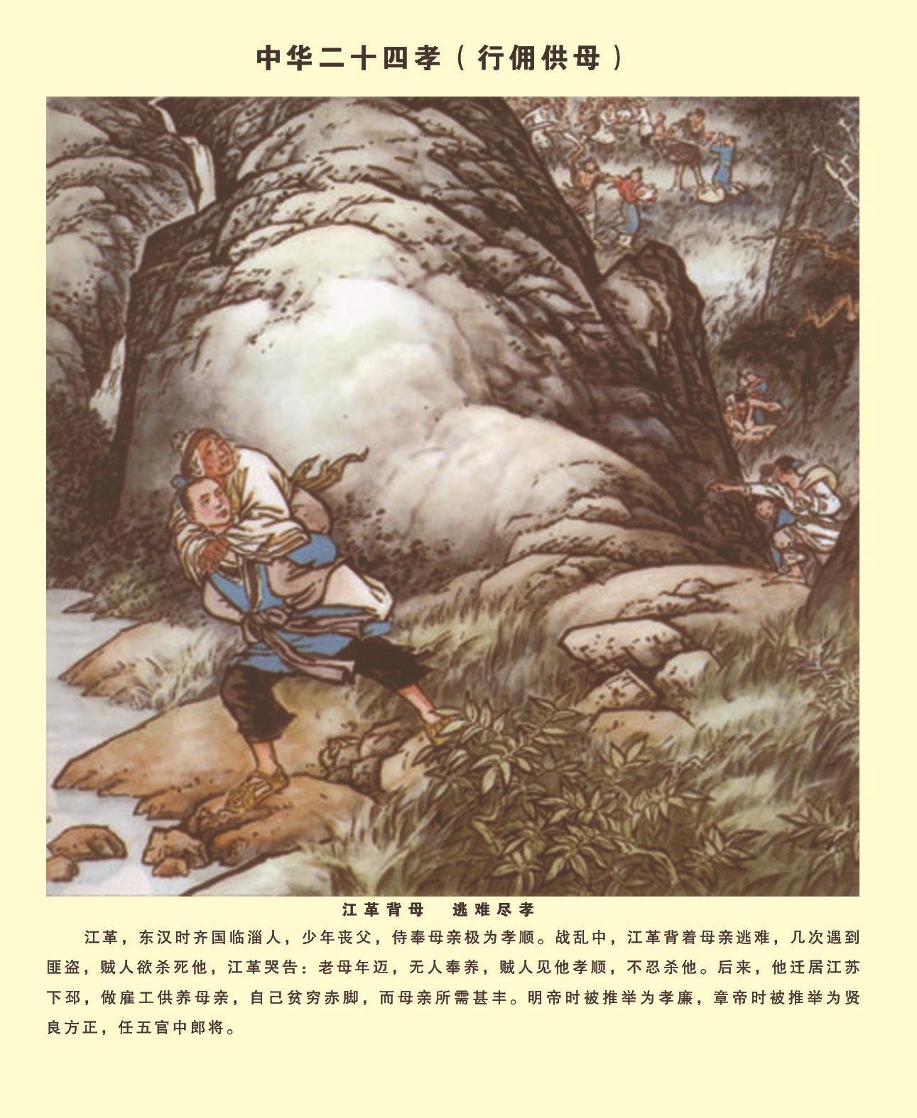 江革,东汉时齐国临淄人,少年丧父,侍奉母亲极为孝顺。战乱中,江革背着母亲逃难,几次遇到匪盗,贼人欲杀死他,江革哭告:老母年迈,无人奉养,贼人见他孝顺,不忍杀他。后来,他迁居江苏下邳,做雇工供养母亲,自己贫穷赤脚,而母亲所需甚丰。明帝时被推举为孝廉,章帝时被推举为贤良方正,任五官中郎将。