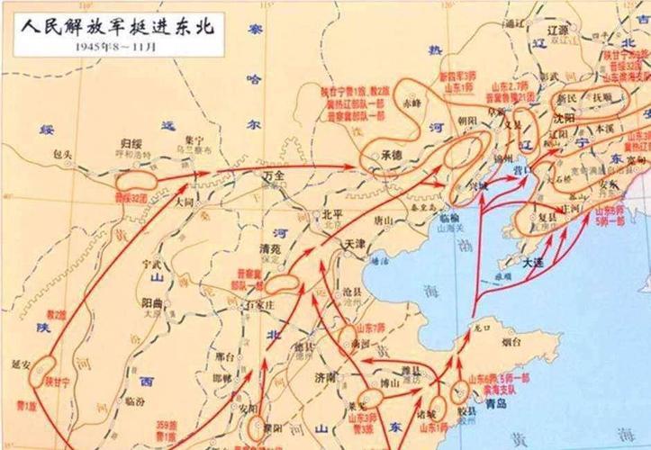 1945年9月下旬,由关内各解放区先后调运抵达东北的部队有:八路军山东军区直属部队6个师,及鲁中、滨海、胶东和渤海等军区主力,共6万余人;新四军第三师,约3万余人;陕甘宁晋绥联防军359旅等部万余人;晋绥、冀中、冀鲁豫军区各一个团。同时,延安及晋察冀、太行、晋绥、华中等各解放区的党政军干部约2万人。