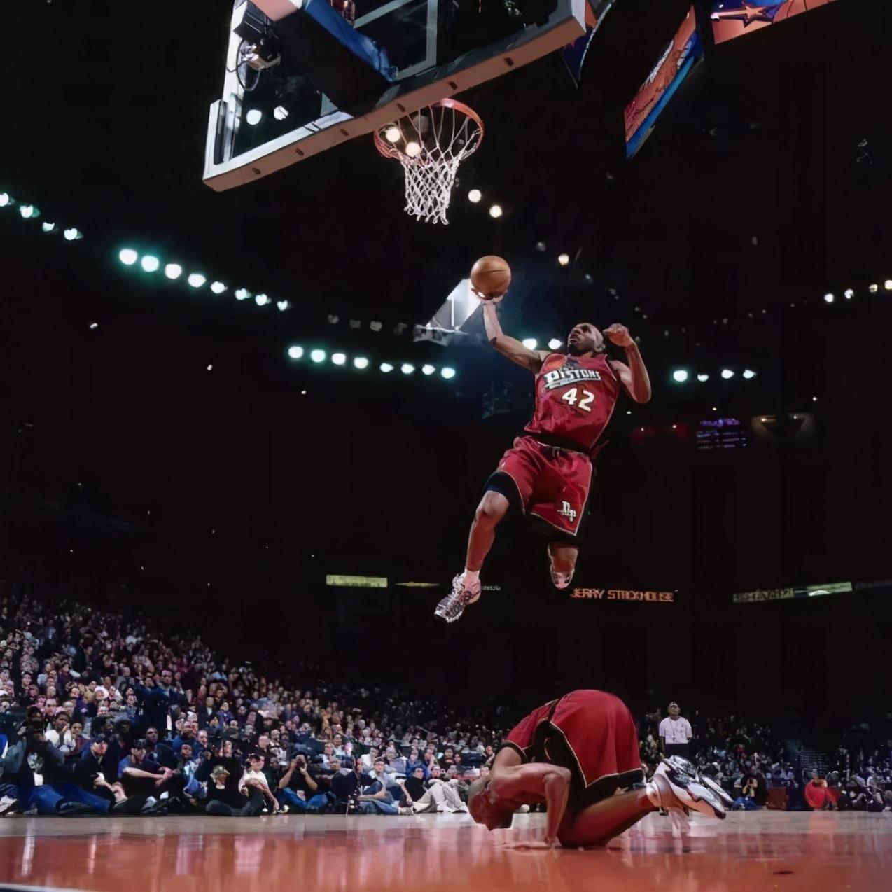 2000年扣篮大赛,斯塔克豪斯飞跃希尔,希尔的姿势更像是匍匐在王者脚下,不得不说,希尔脾气真好
