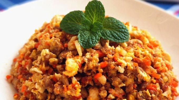 开火放猪油或橄榄油爆香大蒜仔,放肉翻炒片刻,然后放生抽,耗油,盐,下胡萝卜丝,胡萝卜难熟多炒一会。