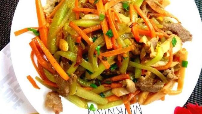 胡萝卜快熟下黄瓜丝,黄瓜容易熟,翻炒时间短。
