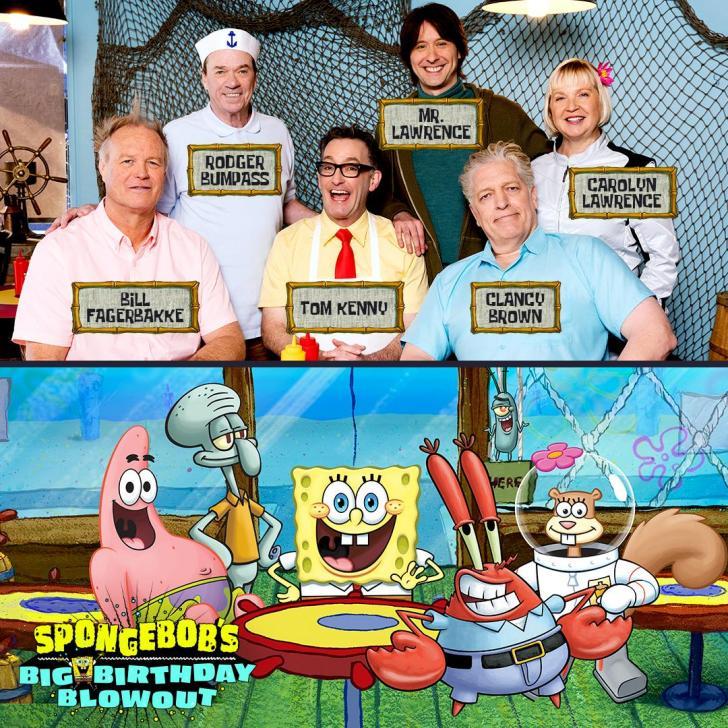 官方除了放出20周年所有角色海报,还公布了海绵宝宝、派大星、章鱼哥、蟹老板、痞老板以及珊迪的配音演员合照。
