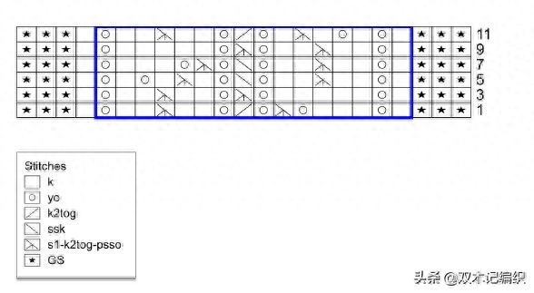 大概过程:起针87针,(包含左右各3针边针)16针一个花,起针数为n*16 1 6(边针)即可,我比原版多了一个花。先织6行搓板针(我织了4行),然后按图解织花,左右3针边针织搓板针,织到合适的长度,织6行搓板针收针即可。