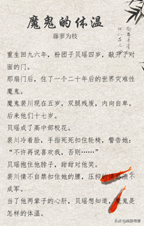 藤萝为枝的《魔鬼的体温》男主真残疾,腿从膝盖以下没有。以后也不会好。敏感自卑x治愈天使,青梅竹马互宠日常文。从四岁到婚纱,正能量文。
