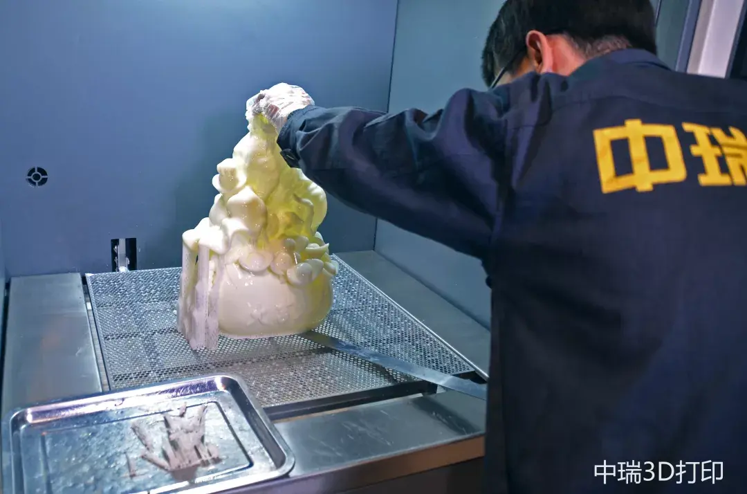 支撑去除后用酒精进行擦洗,去除表面残留的树脂材料。 然后利用高压气枪对模型进行冲洗,吹掉残余酒精和树脂。