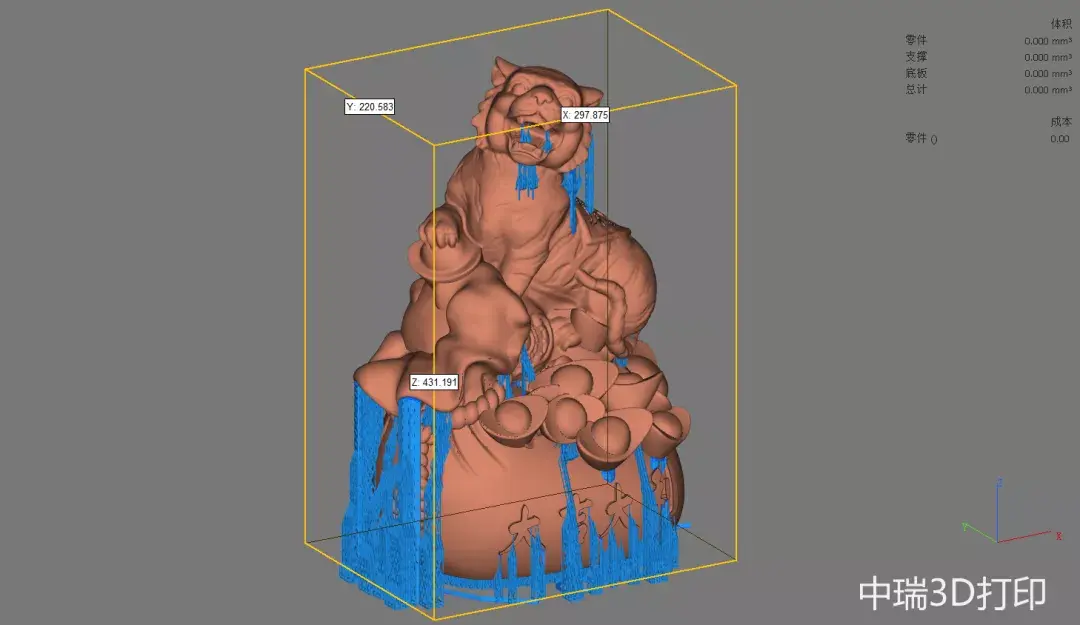 如果将实体的三维立体零件比做大楼,3D打印过程便如同建大楼一般,需要为形态各异的大楼(零件)设计好脚手架(支撑)。将招财虎三维模型导入3dLayer(三维支撑分层处理软件)中,对模型添加支撑。