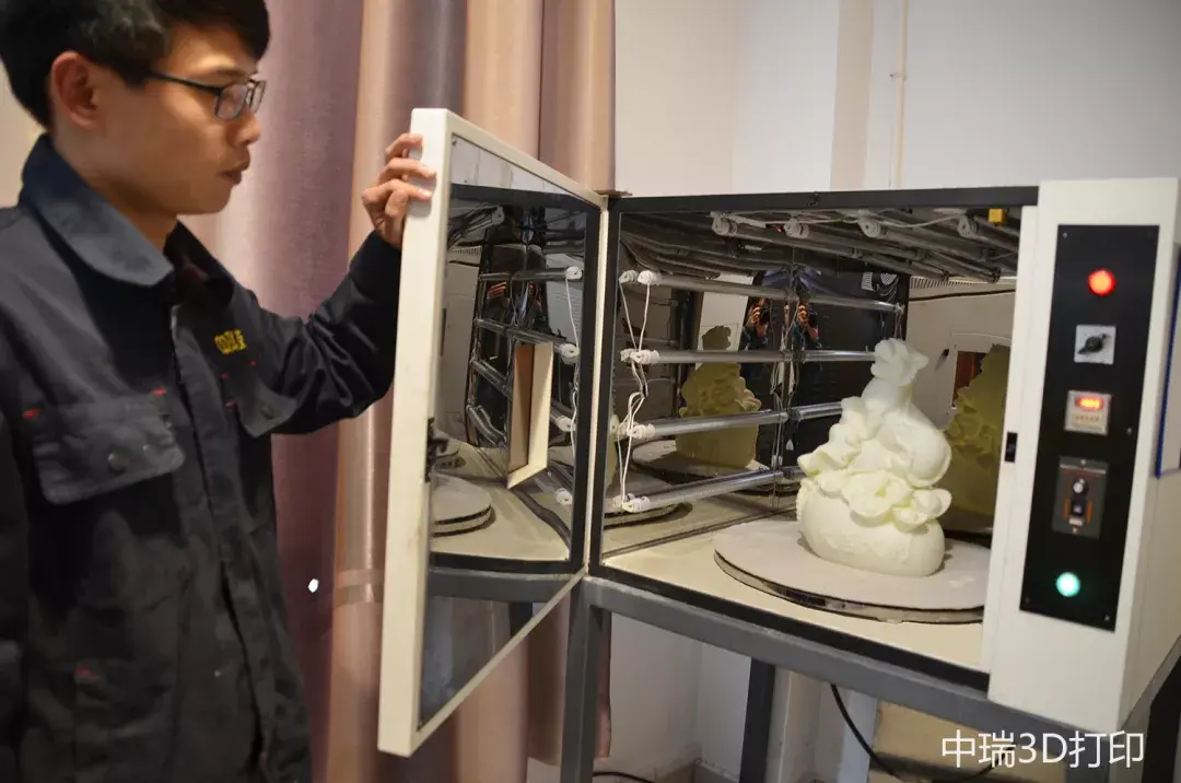 由于刚打印出来的招财虎表面没有完全表干,需要放进固化箱通过紫外线的照射进行表干,一般固化时间为10分钟。