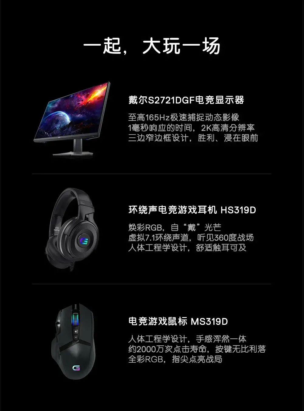 除了有专业配置、强劲性能加持,游匣G15 11代Intel版还准备了更多专业电竞配件:S2721DGF电竞显示器、HS319D电竞游戏耳机、MS319D电竞游戏鼠标,齐全配备,已迫不及待与你组成超强战队!一起,大玩一场~