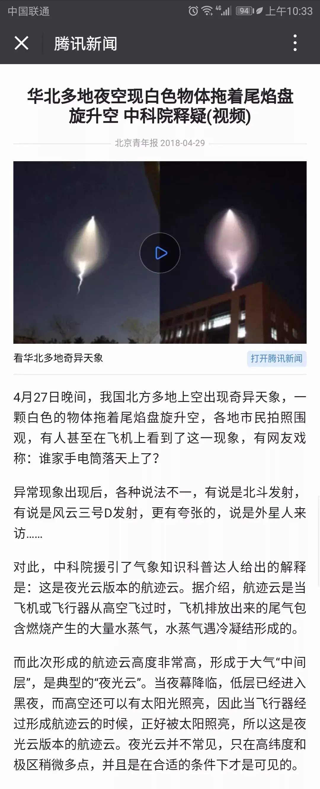 4月27日,华北多地天空出现不明飞行物,一颗白色的物体拖着尾焰盘旋升空。多地市民肉眼可见。可是这个不明飞行物究竟是什么呢?