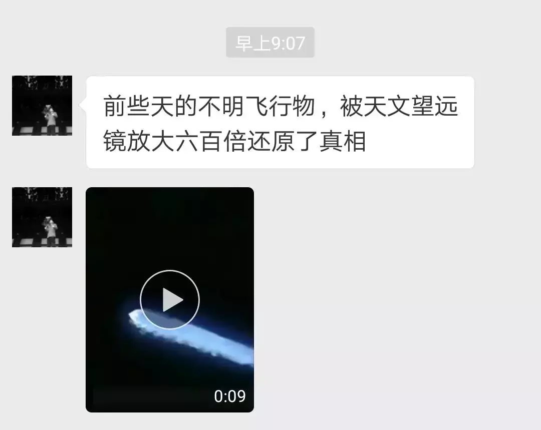 这时候,解先生发来消息问我的看法,从视频截图我看出来这是一段录制的被放大的夜空飞行器,感觉神神秘秘的。我只知道他平时是一个动漫爱好者,有时候还做点自己的设计,没想到他也对天文事件这么感兴趣?