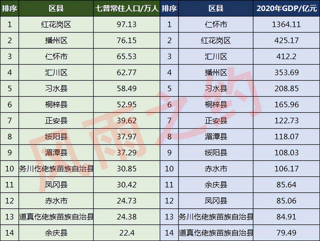 遵义市总面积30762平方千米,下辖3个市辖区(红花岗区、汇川区、播州区)、7个县(桐梓县、绥阳县、正安县、凤冈县、湄潭县、余庆县、习水县)、2个自治县(道真仡佬族苗族自治县、务川仡佬族苗族自治县)、2个县级市(赤水市、仁怀市)共计14个县级行政区,以下为遵义各区县的人口分布及经济发展情况。
