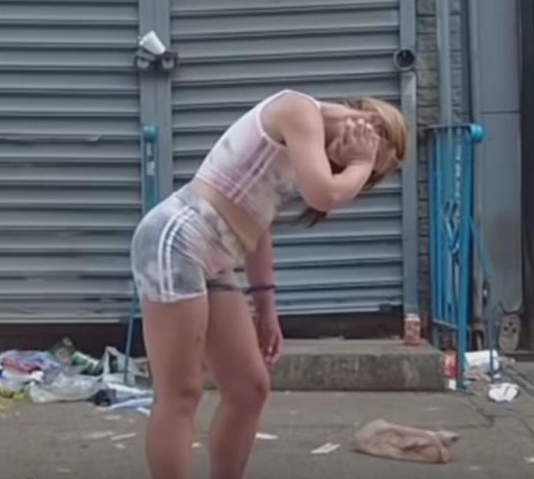 一位三位孩子的母亲,站在街头中央,弯着腰,面朝地,黄色的头发散落在一边,两只胳膊像是死人一般,无力的垂在两侧,一动不动。