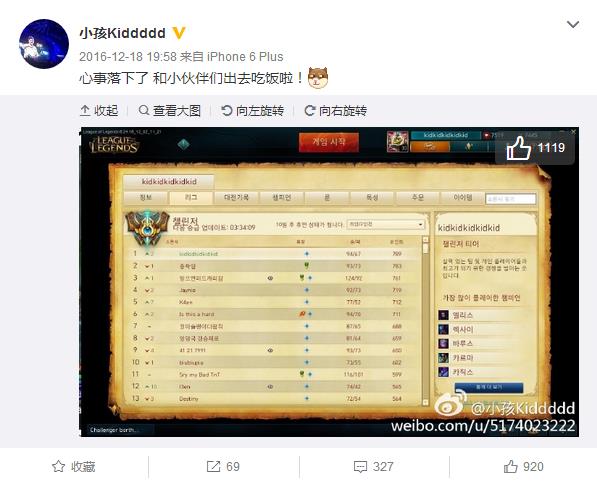 最近Zzitai转会SS后,勤奋苦练的小孩在韩服疯狂地冲分,在2016年12月28日晚终于登顶!