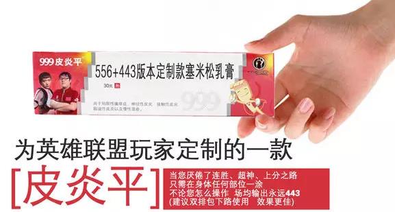 在S5的赛场上,IG vs OMG的一场比赛中,小孩用VN打出了443的数据,之前IG的辅助Kitties(射可可)打出了辅助单场最低数据556,网友们无限的想象443加上556就是999,就又出现了“999皮炎平最强代言”的梗。