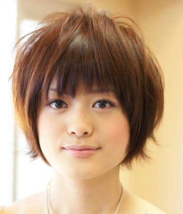 国字脸适合的短发发型,超过眉毛的刘海头发,发梢向一边卷曲,齐下颚的发丝,覆盖住脸颊,令方脸型变圆润精巧,甜美又阳光的清新女人味,熟女的成熟与优雅气息。