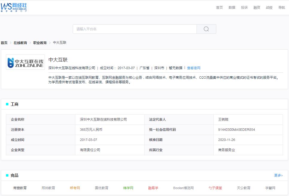 据网经社企业库(COP.100EC.CN)显示,“中大互联”隶属于深圳中大互联在线科技有限公司,法定代表人王锐晓,是一家以在线互联网教育、互联网金融服务为核心业务,结合网络技术、电子商务应用技术、O2O流量集中供应的商业模式的证书考试的服务平台,为学员提供考试信息发布、在线咨询、课程报名等服务。