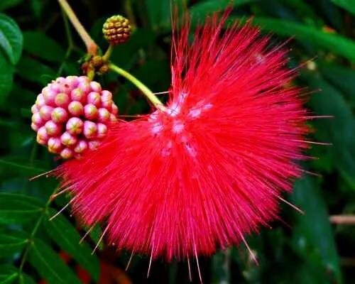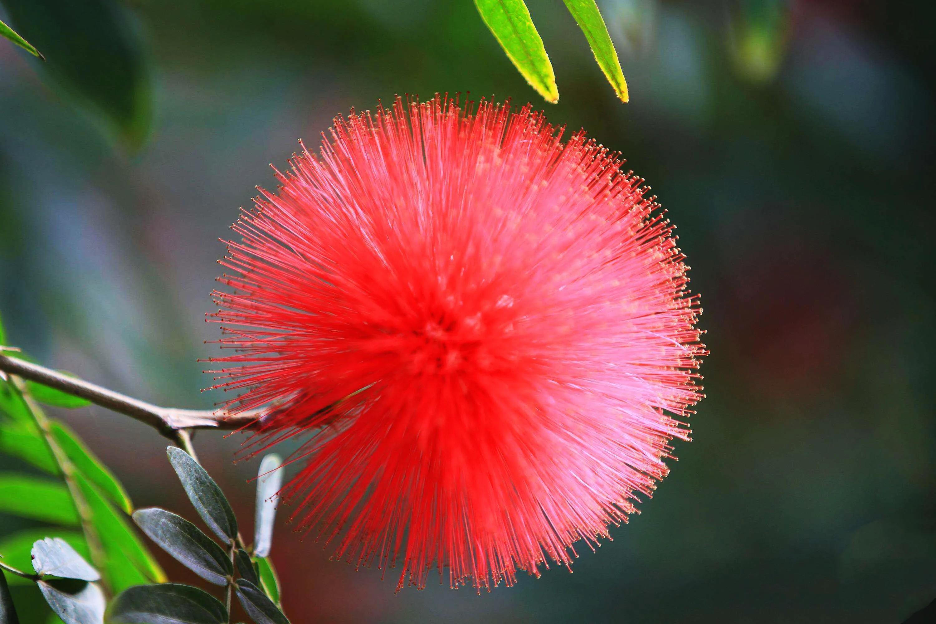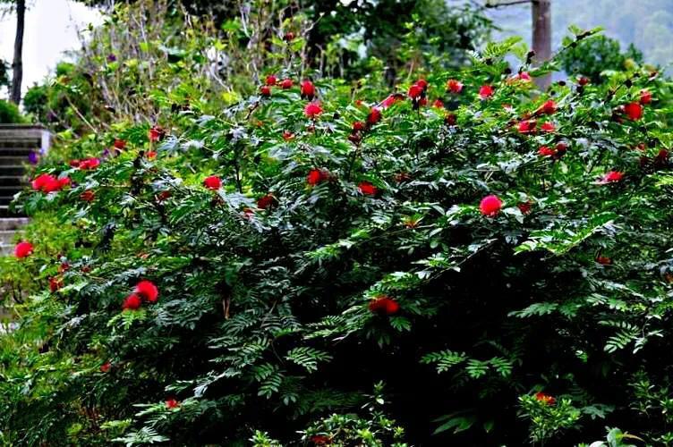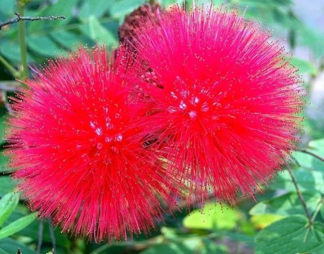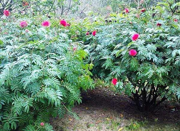 朱缨花 株丛枝条开展。二回羽状复叶,小叶斜披针形。头状花序腋生,直径约3厘米,花深红色。