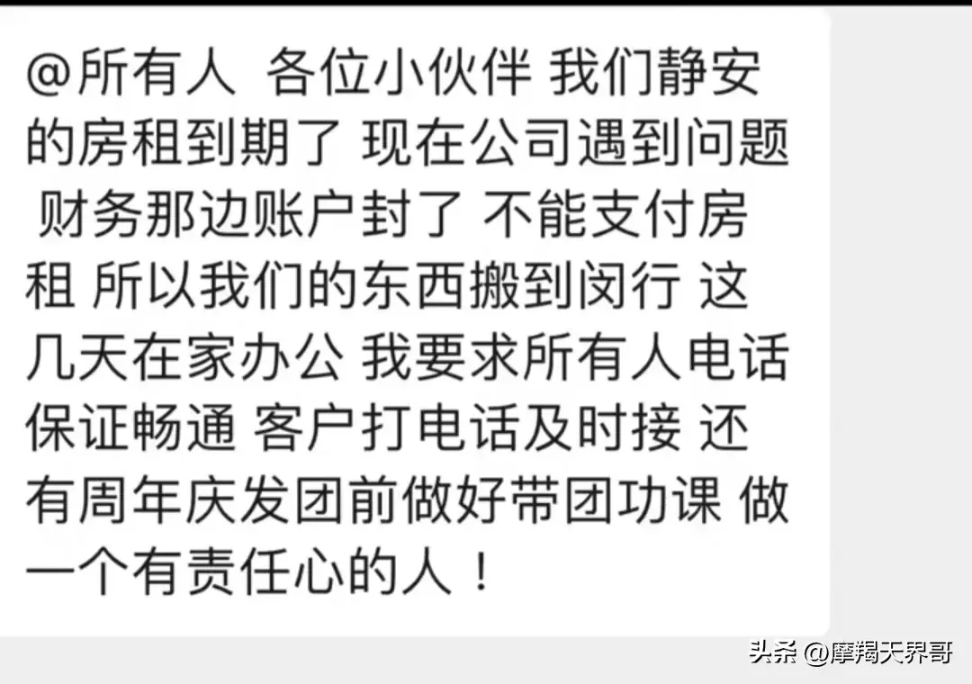 内部群发的通知这样写的,房租到期,公司遇到问题账户被封,不能付房租,所有员工在家办公,必须接客户电话进行安抚,做一个有责任心的人,发完这个通知后,业务经理带头跑路了,呵呵。