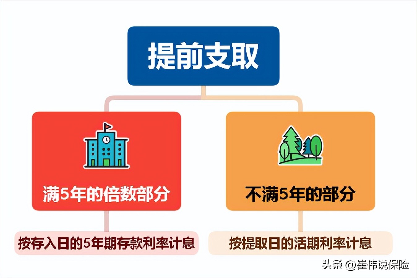 存入时间满5年的倍数部分按照5年普通存款的利率来算,不满5年的部分按照活期来计息。