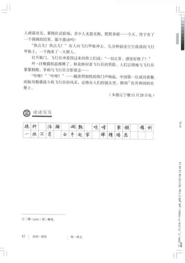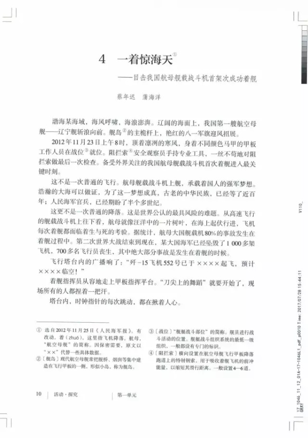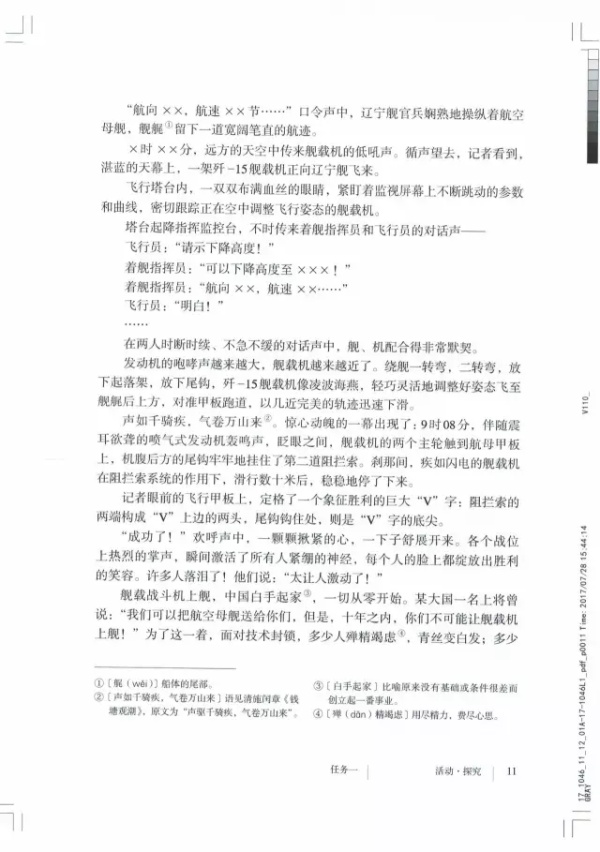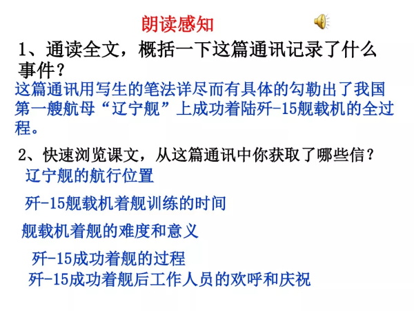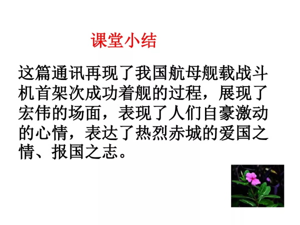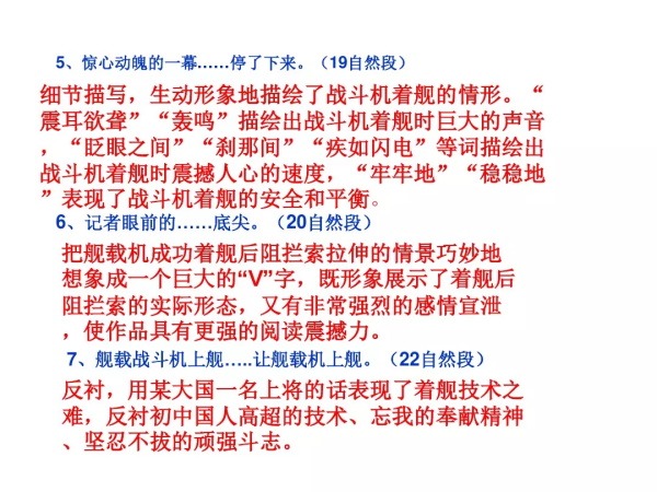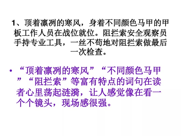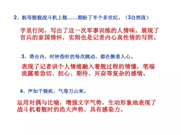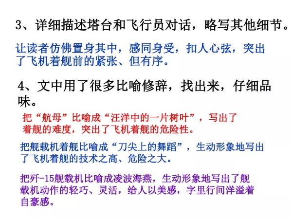 本文抓住歼-15舰载战斗机首架次成功着舰这一最具历史意义的时刻,采用现场特写的写法,生动地再现了我国航母舰载战斗机首架次成功着舰那惊心动魄的一刻,流露出作者强烈的自豪之感。